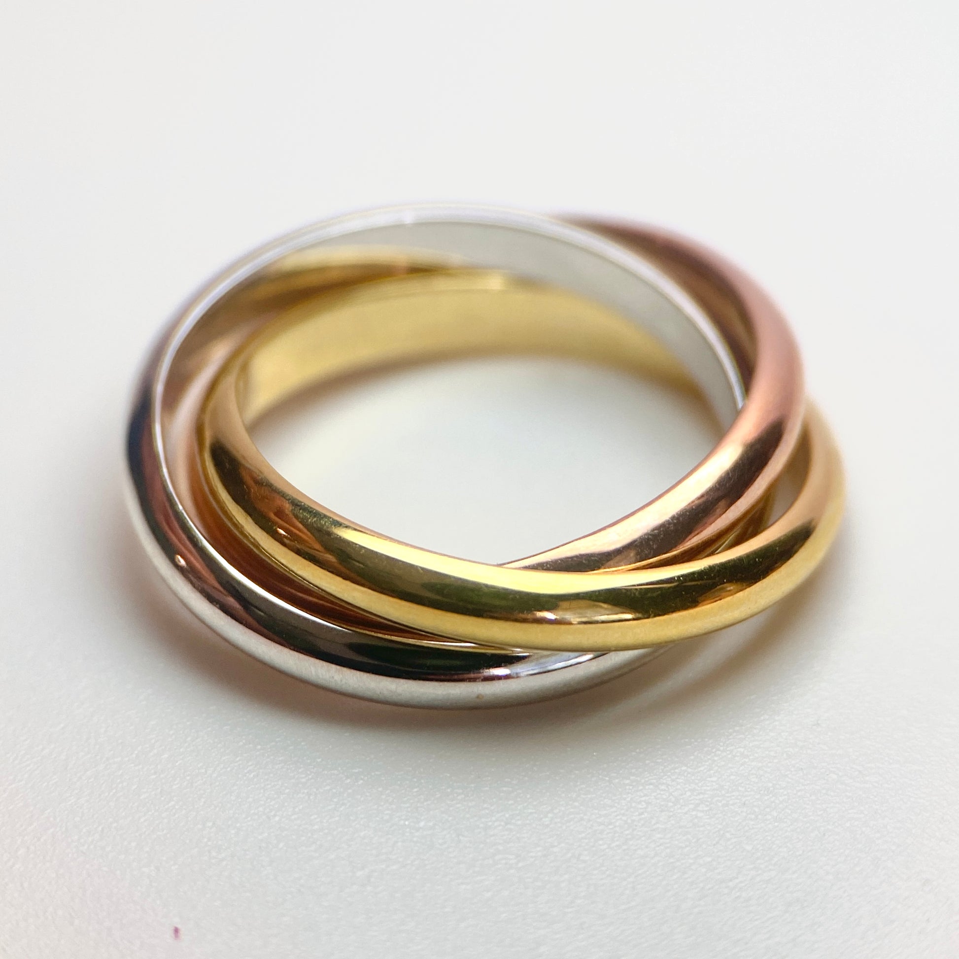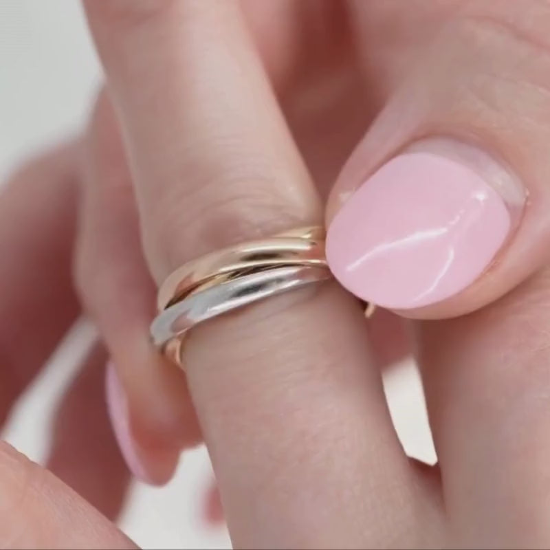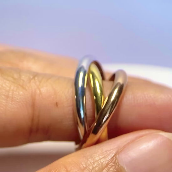 This rolling ring intertwines a trinity of 18k rose, yellow, and white gold bands. The three bands roll over one another in an elegant and comfortable fashion.