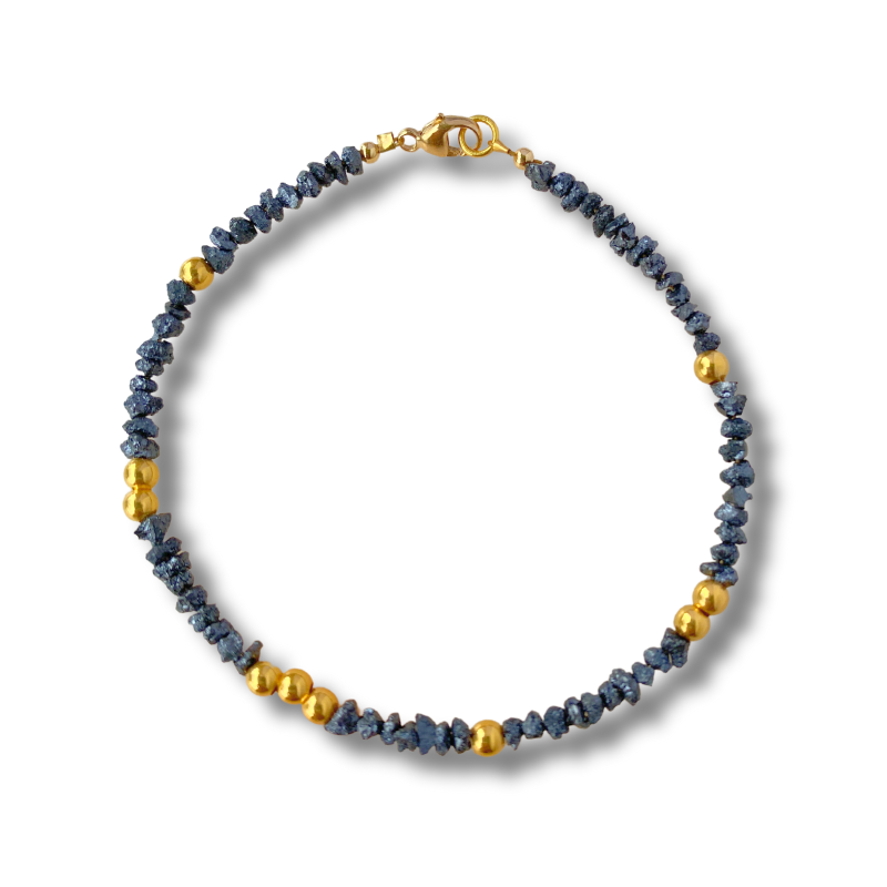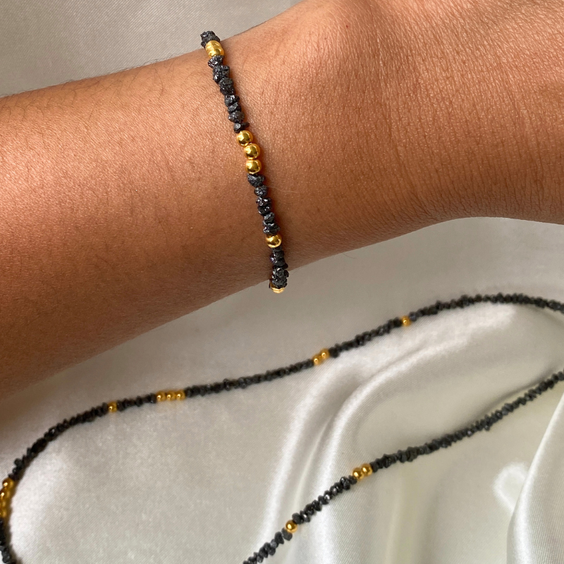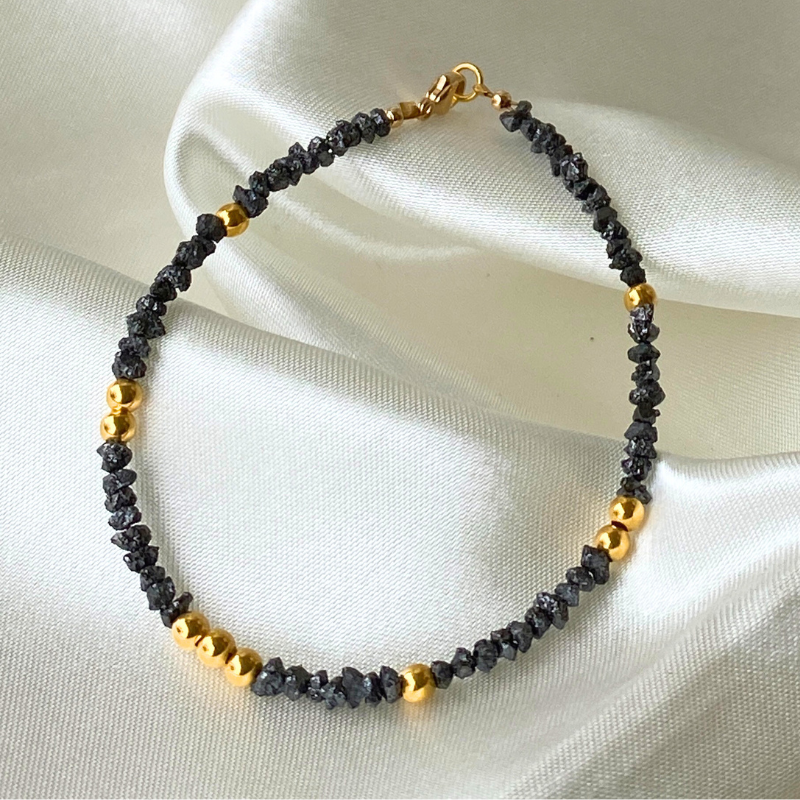 This stunning bracelet features rough black diamond chips, celebrated for their natural allure and understated sophistication. Accented with a generous sprinkling of solid 18k gold beads, it strikes a harmonious balance between raw beauty and refined elegance.